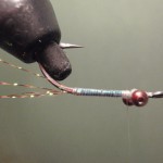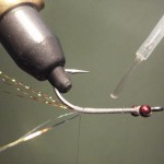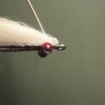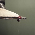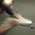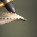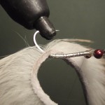 6) Remove the hook from the vice and peirce a length of rabbit strip onto the hook.