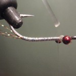 3) Wrap your base layer of thread down to the bend end of the hook.  Add 4 strands of crystal flash and 2 strands of flashabou to the hook.  Add a dab of cement for strength.