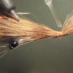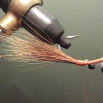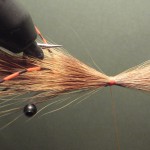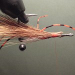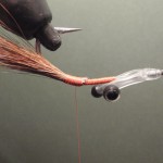 | MATERIALS: – Diiachi size 1 saltwater hook #2546 – Size 5.4gr 20mm length black “Y” style Eyes-n-Tubes eyes – Tan/brown squirrel tail – Orange/black rubber legs – Rootbeer crystal flash – Orange thread |