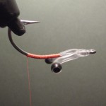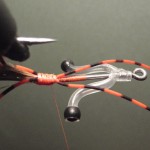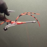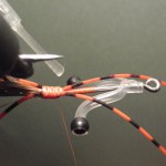 ![]() Step #5 5) Attach 2 pieces of orange/black rubber legs to the bend end of the hook. Leave approx. 6cm of rubber legs in front of the fly. |