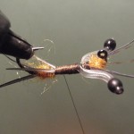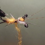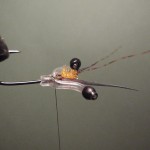 MATERIALS: – Jig hook mustad 32833 BLN #10 – Rootbeer crystal flash – Amber/gold dubbing – 2.4 gr or 5.4 gr 14 mm “Y”style Eyes-n-Tubes eyes – Biots (dark brown) |