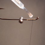 2) Put a base layer of thread onto the hook and add some cement, slide the eyes into position and tie in place.