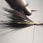 3) Tie black marabou and 4 pieces of flashabou onto the bend end of the hook.