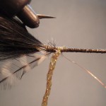 6) Wrap your grizzly hackle evenly spaced toward the eyes. Then wrap in reverse direction with copper wire.