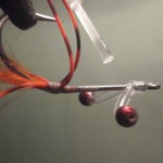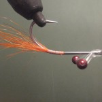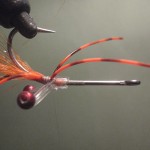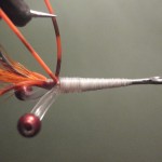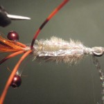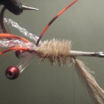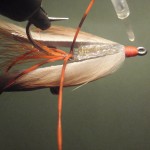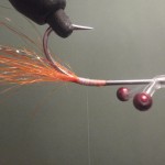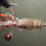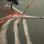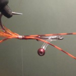![]() Step #3 3) Add 2 6cm pieces of rootbeer crystal flash over the orange bucktail. |