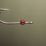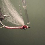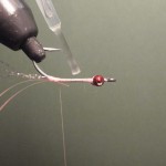 3) Slide the eyes into place near the eye of the hook, and tie into place.  Add 4 pieces of pearl crystal flash and 2 lengths of flashabou to the bend end of the hook.  Add a light coat of cement along thread.
